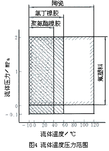 | (1) 襯里材料(或直接與介質(zhì)接觸的測(cè)量管) 常用襯里材料有氟塑料、聚氨酯橡膠、氯丁橡膠和陶瓷等。近年有采用高純氧化鋁999.7%AI2O3)陶瓷制成襯里的,但只限中小口徑傳感器。 氯丁橡膠和玻璃鋼用于非腐蝕性或弱腐蝕性液體,如工業(yè)用水、廢污水及弱酸堿,價(jià)格*為低廉。氟塑料具有優(yōu)良的耐化學(xué)腐蝕性,但耐磨性差,不能用于測(cè)量礦漿液。氟塑料中*早應(yīng)用的是聚四氟乙烯,因與測(cè)量管間僅靠壓貼,無(wú)粘結(jié)力,不能用于負(fù)壓管道,后開(kāi)發(fā)各種改性品種,實(shí)現(xiàn)注塑成形,與測(cè)量管有較強(qiáng)結(jié)合力,可用于負(fù)壓, 聚氨酯橡膠有極好的耐磨耗性,但耐酸堿的腐蝕性較差。它的耐磨性相當(dāng)于天然橡膠的10倍,適用于煤漿、礦漿等;介質(zhì)溫度要低于40~60/70℃。氧化鋁陶瓷有極好的耐磨耗性和對(duì)強(qiáng)酸堿的耐磨腐蝕性,耐磨性約為聚氨酯橡膠的10倍,適用于具有腐蝕性的礦漿;但性脆,安裝夾緊時(shí)疏忽易碎,可用于較高溫度(120~140/180℃)但要防止溫度劇變,如通蒸汽**,一般溫度突變不能大于100℃,升溫150℃ 要有10min時(shí)間。 通用型EMF幾種材料的壓力溫度大體適用范圍可參閱圖4。 | |
